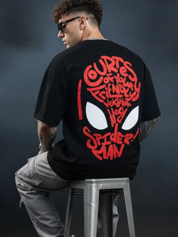 Spiderman Black Oversized Back Typographic Printed T-shirt for Men